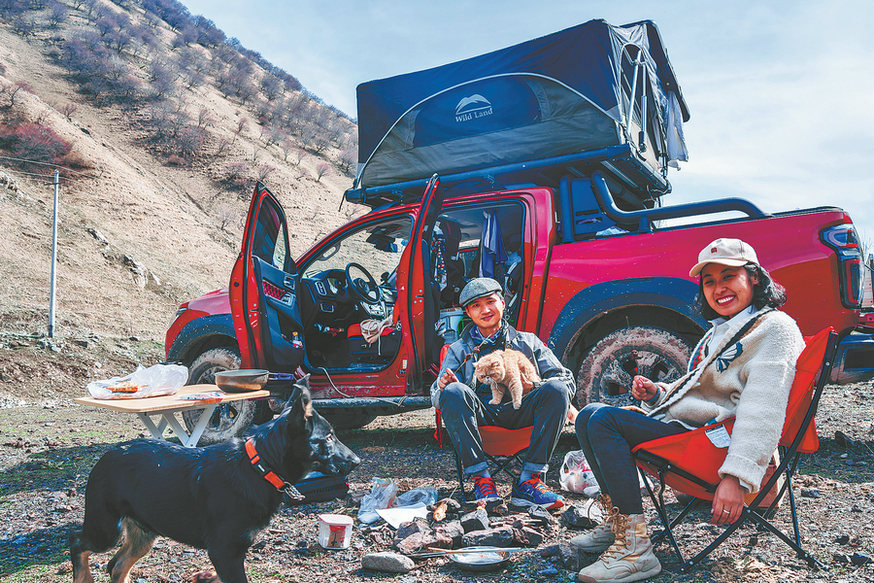 Li Yaming, 34, is driving while his wife, Jiang Yao, 29, is the front-seat passenger. It's a lovely road trip for the couple and their two pets. At night, Li and Jiang sleep in a rooftop camp while their cat rests in the car and their dog sleeps beside the car as a guard when the weather is good.