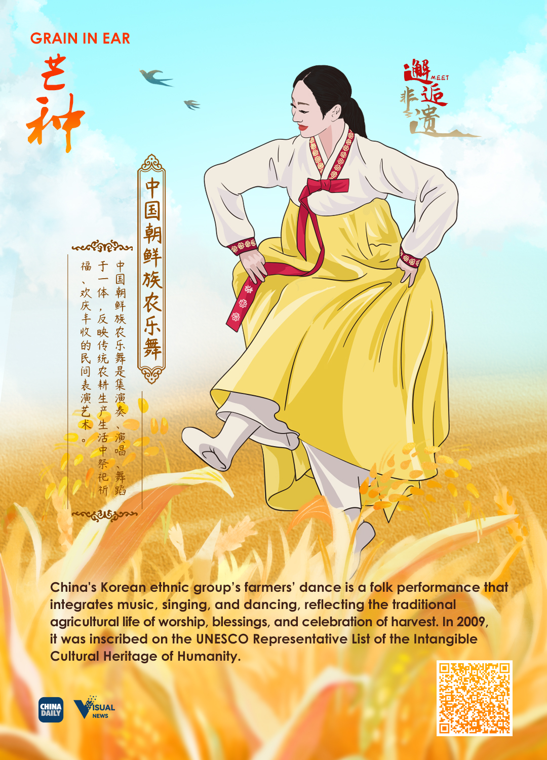 The Chinese solar calendar divides the year into 24 solar terms. Grain in Ear, (Chinese: 芒种), the 9th solar term, begins on June 5 this year and ends on June 20.