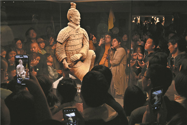 Tourists appreciate a Terracotta Warrior at the Emperor Qinshihuang's Mausoleum Site Museum in Xi'an, Shaanxi province. [Photo by Zhang Tianzhu/For China Daily]
